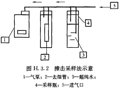 2 采樣瓶?jī)?nèi)注入30mL超純水,用管子按圖H.3.2所示將各部分連接起來(lái)。去濕管是為了保證沒(méi)有水滴被吸入采樣泵。