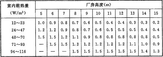 H.0.3 散熱量有效系數(shù)m值宜按相同建筑物和工藝布置的實測數(shù)據(jù)采用,當(dāng)無實測數(shù)據(jù)時,單跨生產(chǎn)廠房可按下式計算: