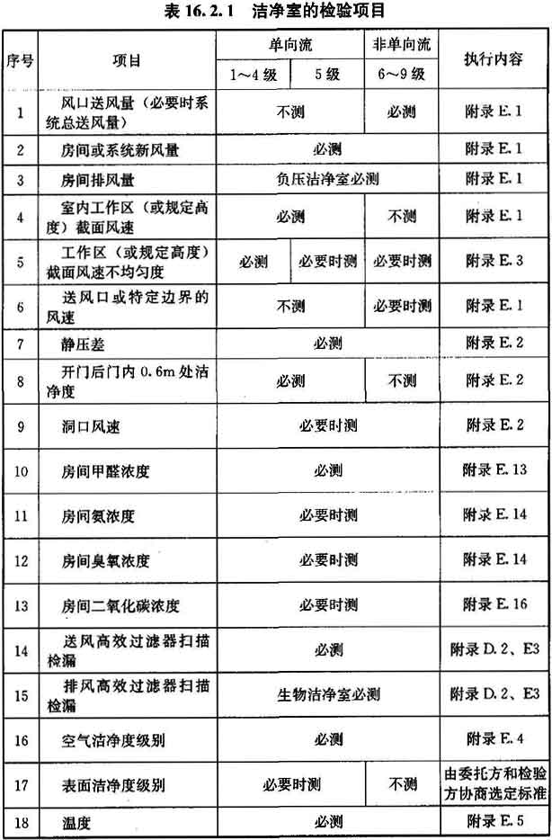 16.2.1 潔凈室在高效過濾器現(xiàn)場(chǎng)檢漏后的必測(cè)項(xiàng)目,應(yīng)符合表16.2.1的要求,也可由該表選擇選測(cè)項(xiàng)目。