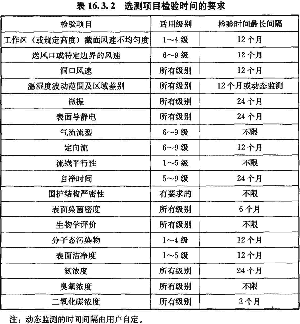 16.3.2 在工程驗(yàn)收后為確認(rèn)潔凈室的選測(cè)項(xiàng)目符合要求的日常檢驗(yàn)(不含臨時(shí)抽測(cè))周期可按表16.3.2確定。