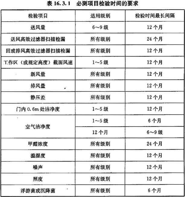 16.3.1 在工程驗(yàn)收后為確認(rèn)潔凈室的必測(cè)項(xiàng)日符合要求的日常檢驗(yàn)周期,可按表16.3.1確定。