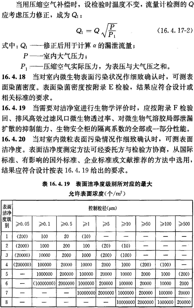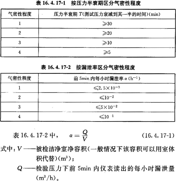 16.4.17 當(dāng)對(duì)潔凈室的嚴(yán)密性有特殊要求時(shí),可測(cè)其圍護(hù)結(jié)構(gòu)嚴(yán)密性。圍護(hù)結(jié)構(gòu)嚴(yán)密性按附錄G檢驗(yàn)。檢驗(yàn)結(jié)果應(yīng)符合設(shè)計(jì)要求。當(dāng)設(shè)計(jì)無明確要求時(shí),可在以下兩表的任何一種評(píng)定方法中任選一種方法,兩表中最大測(cè)試壓力設(shè)定為500Pa。