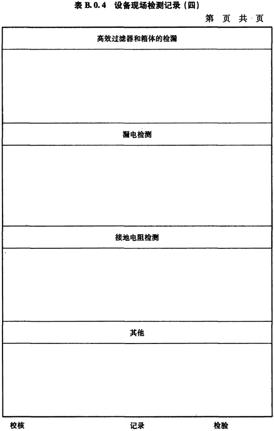 B.0.4 排風高效過濾器的檢漏、生物安全柜箱體的檢漏、生物安全柜漏電檢測、接地電阻檢測等的檢測應按表B.0.4進行記錄。