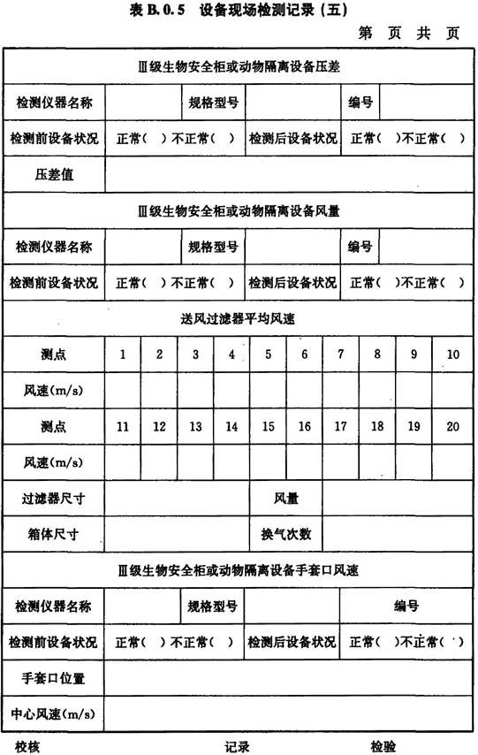 B.0.5 Ⅲ級生物安全柜或動物隔離設備的壓差、風量、手套口風速的檢測應按表B.0.5進行記錄。