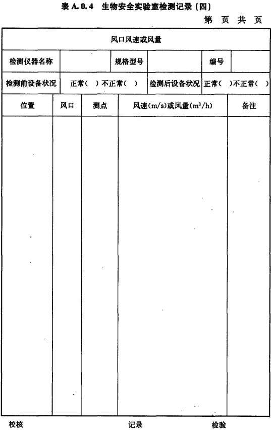 A.0.4 生物安全實驗室風(fēng)口風(fēng)速或風(fēng)量的檢測應(yīng)按表A.0.4進(jìn)行記錄。