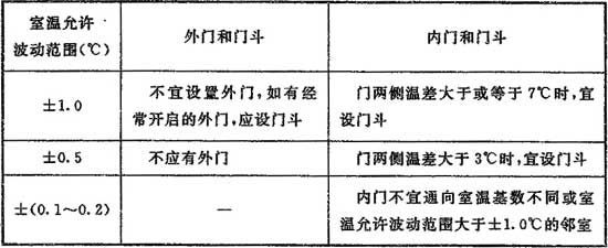 8.1.12 工藝性空氣調(diào)節(jié)區(qū)的門和門斗應符合表8.1.12的規(guī)定。外門門縫應嚴密,當門兩側(cè)的溫差大于或等于7℃時,應采用保溫門。