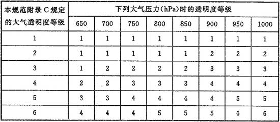 4.3.4 采用本規(guī)范附錄C和附錄D時(shí),當(dāng)?shù)氐拇髿馔该鞫鹊燃?jí)應(yīng)根據(jù)本規(guī)范附錄E及夏季大氣壓力按表4.3.4確定。